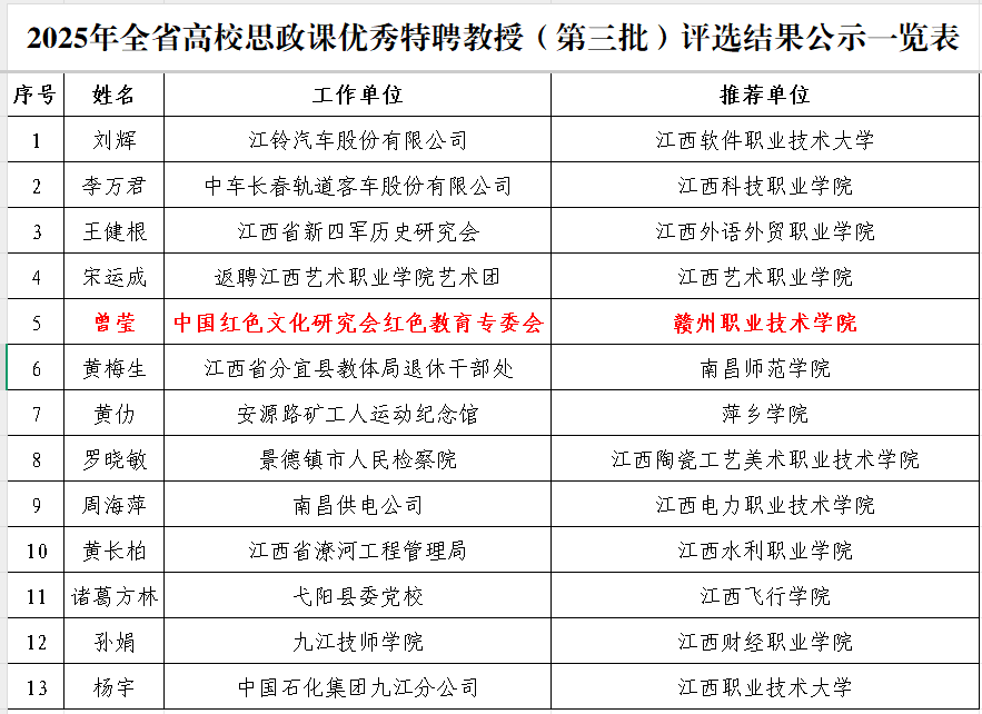 其中,中国红色文化研究会红色教育专委会曾莹女士作为我校特聘教授,成功入选“全省高校思政课优秀特聘教授(第三批)”。曾莹教授深耕红色教育领域多年,兼具深厚的理论素养与丰富的实践经验,担任国产aⅴ激情无码久久久无码特聘教授期间,始终紧扣红色文化传承与思政教育融合主题,为国产aⅴ激情无码久久久无码思政课队伍建设与红色文化教育开展发挥了重要示范带动作用。