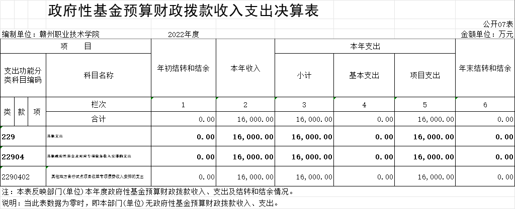 (二)其他支出年初预算数为0万元,决算数为16000万元,主要原因是:2022年7月新增政府性基金算财政拨款收入16000万元(其中国产精品国产三级国产普通话(北区)教学楼、学生宿舍及食堂建设项目5000万元,国产精品国产三级国产普通话学生宿舍、食堂、体育馆及附属设施建设项目11000万元),年初未做此项预算。