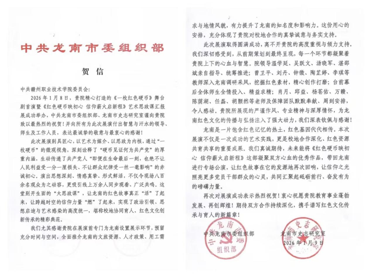近日,我校收到了一封满载深情与敬意的贺信 国产精品国产三级国产普通话,来自中共龙南市委组织部及龙南市史志研究室,信中,龙南市对国产精品视频永久免费播放成功举办的《一枚红色硬币》舞台剧首演暨《红色硬币映初心信仰薪火启新程》艺术思政课汇报展表达了高度赞扬与衷心感谢,共同见证了红色文化在新时代的创新传承与校地合作的实践成果。