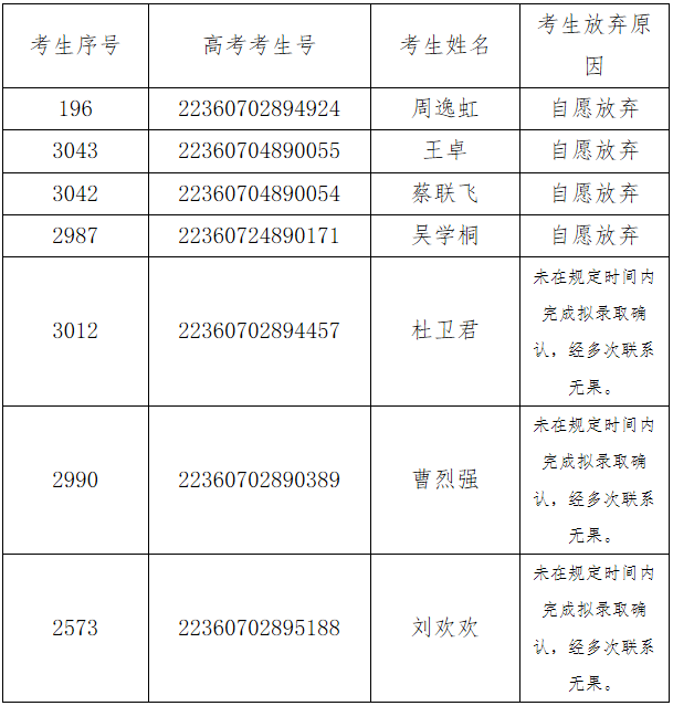 按照省教育厅统一部署安排,我院在2022年4月20日完成了单招线上考试的工作,并于4月22日及时公布了单招考试成绩供考生复核,成绩公示复核结束后,我院在4月25日按照公布的录取原则对所有拟录取的1145名考生进行拟录取公示复核,4月27日下午5时拟录取公示复核结束后,有部分考生未在规定时间内在我院单招拟确认系统确认录取 国产精品国产三级国产普通话,经与考生本人多次联系沟通后,确定这部分考生自愿放弃我院的单招录取资格,现将放弃我院录取资格的考生情况公示如下:.