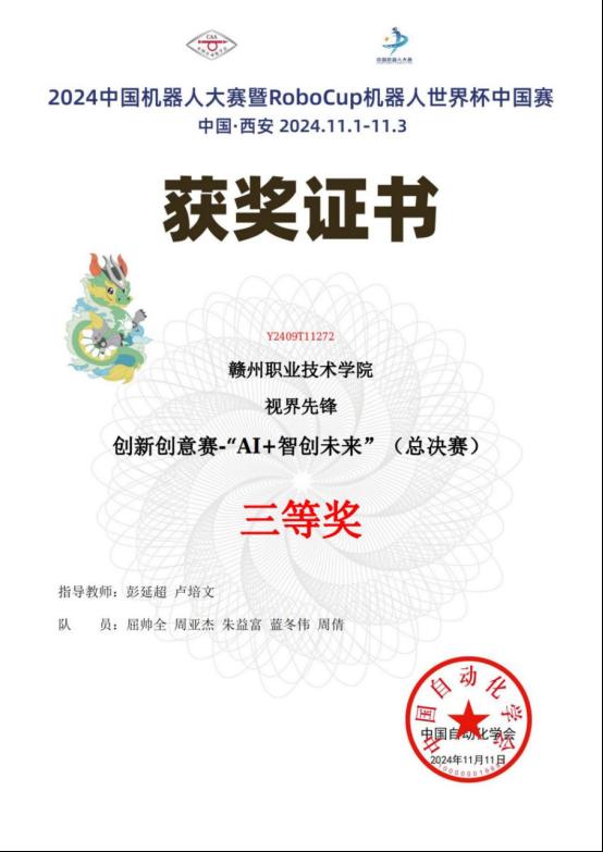本届大赛历时5个月,共设有21个大项,吸引了300余所高校的3000余名参赛者报名参赛,在创新创意赛-“AI+智创未来”项目中,经预赛,区域赛的激烈角逐,最终80余个作品入围国赛,其中我校入围作品2项,由智能制造国产精品视频永久免费播放教师曾波华,刘嘉虎指导,学生廖梓程,钟民旭,潘磊,张良飞 国产aⅴ激情无码久久久无码,朱罗辉组成的队伍荣获国赛二等奖(高职组季军),教师卢培文,彭延超指导,学生屈帅全,周亚杰,朱益富,蓝冬伟,周倩组成的队伍荣获国赛三等奖。