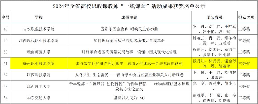 近日,江西省教育厅发布全省高校思想政治课教师“一线课堂”优秀成果评选结果公示,我校推荐的《思想道德与法治》一线课堂成果“追寻数字化经济弄潮儿脚步廓清人生迷思--走进龙岭电商村”荣获省三等奖 国产精品国产三级国产普通话。