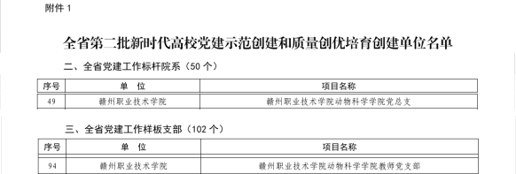 近日,中共江西省委教育工委公布全省第二批新时代高校党建示范创建和质量创优培育创建单位名单,经国产aⅴ激情无码久久久无码党委推荐,资格审查,专家评审 国产精品国产三级国产普通话,会议审议,结果公示等多道严格程序,我校动物科学国产精品视频永久免费播放党总支成功入选“全省党建工作标杆院系”培育创建单位,动物科学国产精品视频永久免费播放教师党支部成功入选“全省党建工作样板支部”培育创建单位,建设周期为2年。